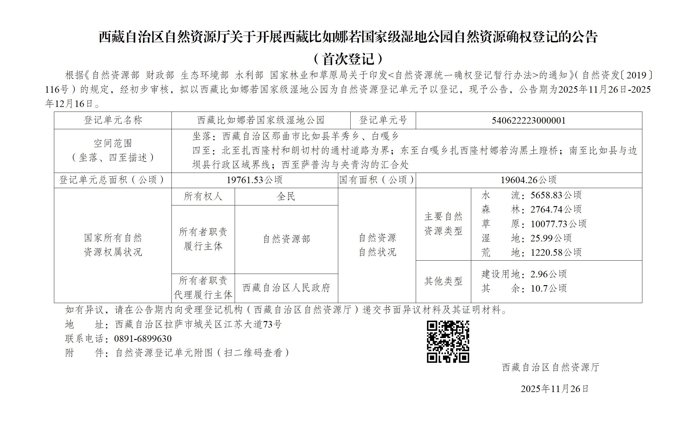 西藏自治区自然资源厅关于开展西藏比如娜若国家级湿地公园自然资源确权登记的公告