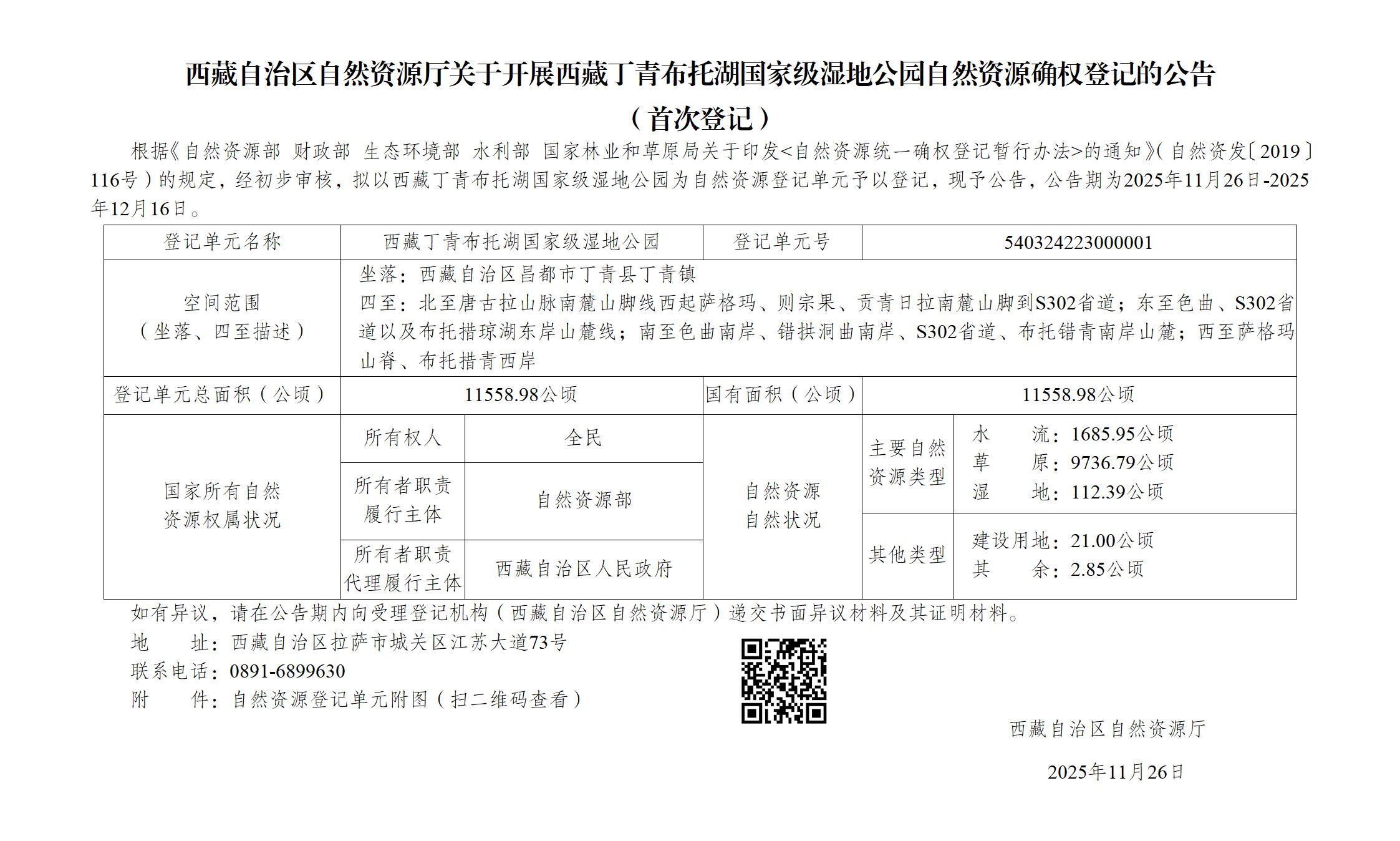 西藏自治区自然资源厅关于开展西藏丁青布托湖国家级湿地公园自然资源确权登记的公告