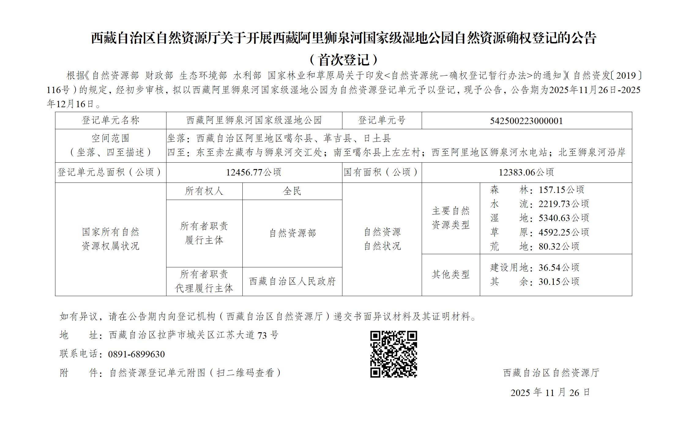 西藏自治区自然资源厅关于开展西藏阿里狮泉河国家级湿地公园自然资源确权登记的公告