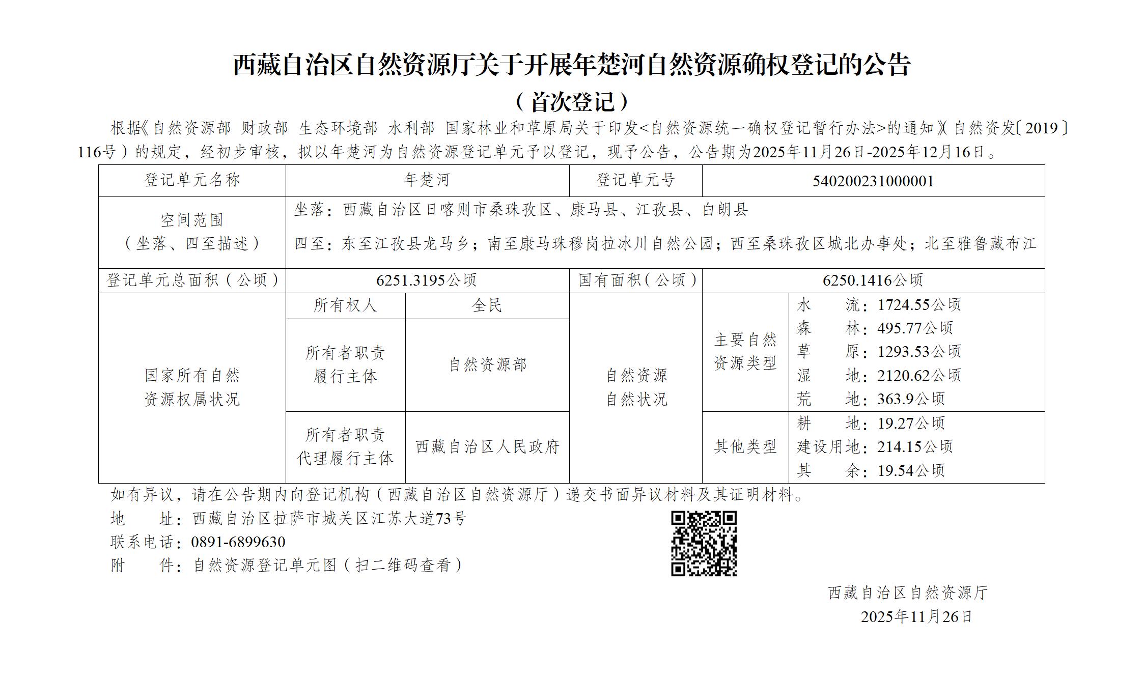 西藏自治区自然资源厅关于开展年楚河自然资源确权登记的公告