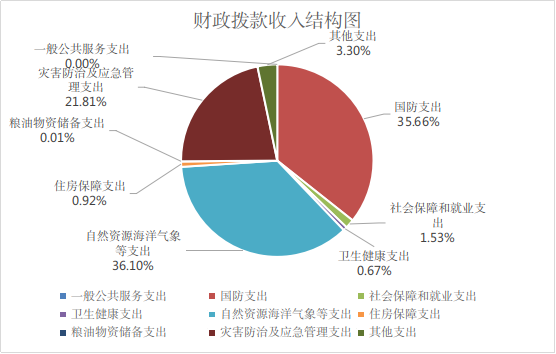 2024年财政拨款总收入55,927.19万元,其中:一般公共服务支出2.66万元,占财政拨款总收入0.00%;国防支出19,946万元,占财政拨款总收入35.66%;社会保障和就业支出853.86万元,占财政拨款总收入1.53%;卫生健康支出372.34万元,占财政拨款总收入0.67%;;自然资源海洋气象等支出20,192.07万元,占财政拨款总收入36.10%;住房保障支出514.87万元,占财政拨款总收入0.92%;粮油物资储备支出5.04万元,占财政拨款总收入0.01%,灾害防治及应急管理支出12,195.34万元,占财政拨款总收入21.81%;其他支出1,845万元,占财政拨款总收入3.30%。