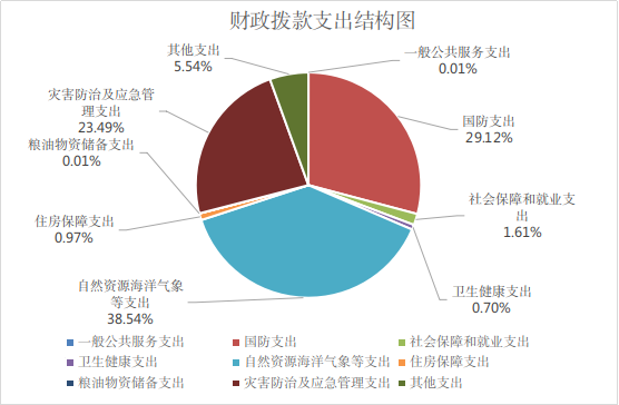 2024年度财政拨款支出52,896.25万元,主要用于以下方面:一般公共服务支出2.66万元,占财政拨款总支出0.01%;国防支出15,405.60万元,占财政拨款总支出29.12%; 社会保障和就业支出853.86万元,占1.61%; 卫生健康支出372.34万元,占0.70%;自然资源海洋气象等支出20,384.25万元,占38.54%;住房保障支出514.87万元,占0.97%;粮油物资储备支出5.04万元,占0.01%;灾害防治及应急管理支出12,425.36万元,占23.49%;其他支出2,932.26万元,占5.54%。