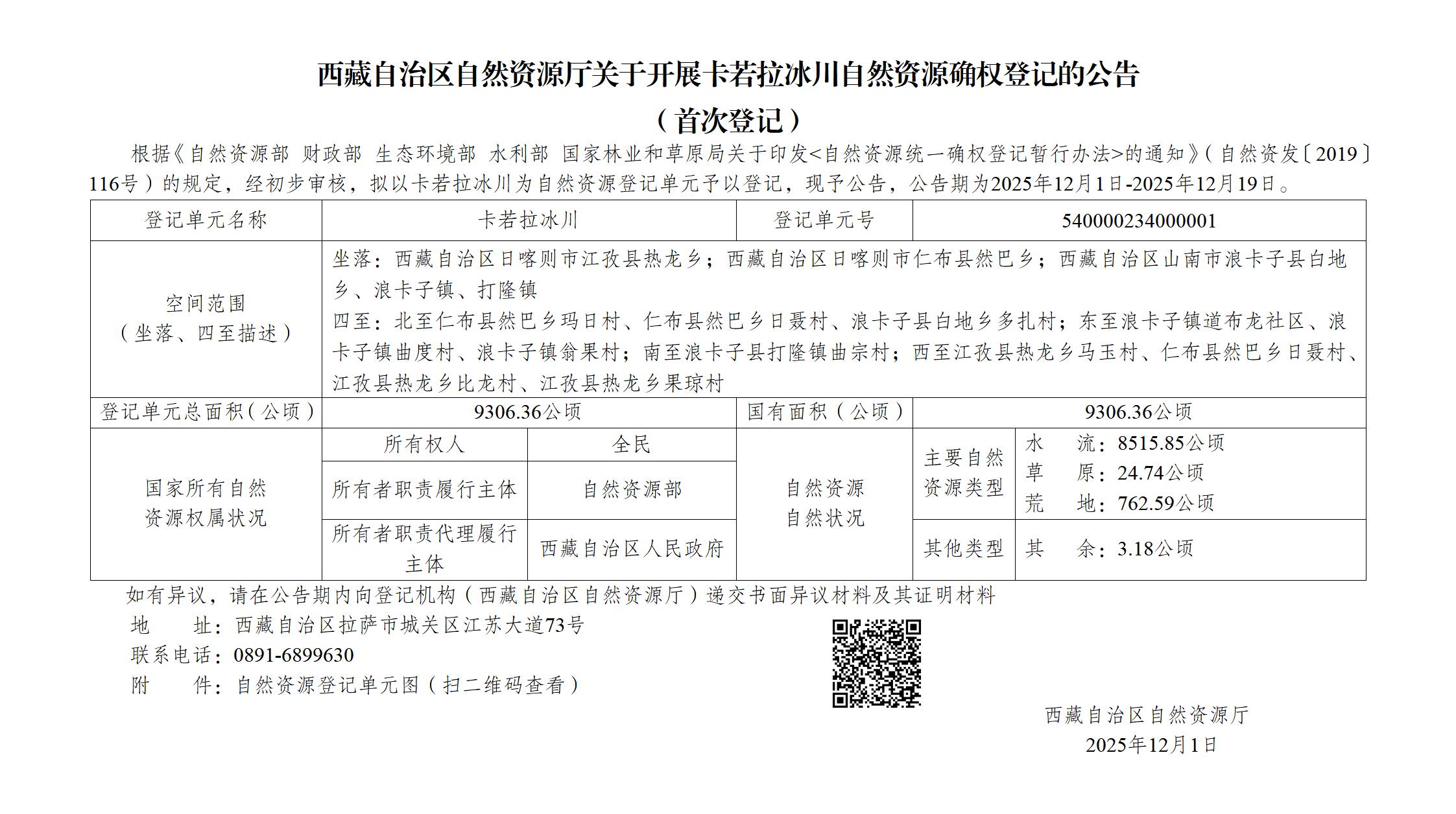 西藏自治区自然资源厅关于开展卡若拉冰川自然资源确权登记的公告